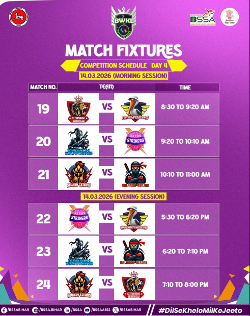 प्रतिदिन सुबह 8.30 से 11 बजे तक और शाम 5.30 से 8 बजे तक लीग मैच होंगे।तो मिलेगा ही साथ ही साथ सभी खिलाड़ियों को प्रतियोगिता में हिस्सा लेने के लिए प्रायोजकों की ओर से 5000/- रुपये प्रोत्साहन राशि के रुप में दिया जाएगा। महिला कबड्डी लीग खेल विभाग, बिहार राज्य खेल प्राधिकरण और बिहार कबड्डी संघ के संयुक्त तत्वावधान मेंआयोजित किया जा रहा है । इस पूरे प्रतियोगिता के आयोजन में बिहार कबड्डी संघ का बहुत मह्त्वपूर्ण योगदान है।