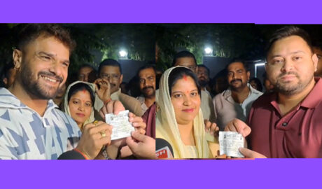 Patna/Chhapra: भोजपुरी सुपरस्टार खेसारी लाल यादव और उनकी पत्नी चन्दा देवी ने गुरुवार को राष्ट्रीय जनता दल की सदस्यता ग्रहण की। राष्ट्रीय जनता दल के नेता तेजस्वी प्रसाद यादव ने दोनों को सदस्यता ग्रहण कराई।