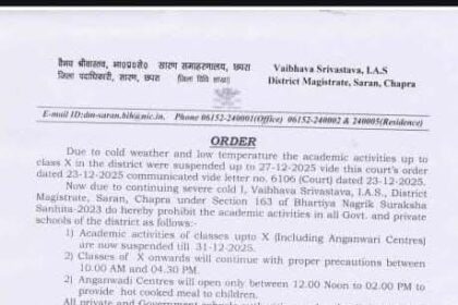 सारण के स्कूलों में 31 दिसंबर तक पठन पाठन स्थगित Chhapra: सारण…
