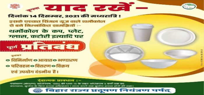 Chhapra: राज्य में 14 दिसंबर से सिंगल यूज़ वाले थर्माकोल से बने कप, प्लेट, गिलास, कटोरी सहित अन्य उपयोग के सामानों पर पूर्ण प्रतिबंध लगाया जा रहा है. बिहार राज्य प्रदूषण नियंत्रण पार्षद के तरफ से जारी सूचना के अनुसार 14 दिसंबर की मध्यरात्रि से यह प्रतिबंध लागू हो जाएगा.