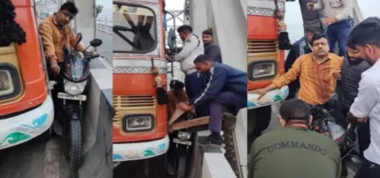 पटना: राजधानी पटना में एक बड़ा हादसा होते-होते रह गया। यहां महात्मा गांधी सेतु पुल पर अचानक एक बाइक सवार ट्रक और पुल की रेलिंग के बीच जाकर फंस गया। इसे देखते ही आस-पास मौजूद लोग आनन-फानन में भागकर शख्स की मदद के लिए पहुंचे।