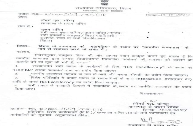 प्रधान सचिव की ओर से लिखे गये पत्र में कहा गया है कि- अब बिहार के राज्यपाल को महामहिम के स्थान पर माननीय राज्यपाल के नाम से संबोधन किया जाएगा। इसके साथ ही राज्यपाल के नाम के आगे श्री अथवा श्रीमती का प्रयोग किया जाएगा। हालांकि विशेष परिस्थिति में केवल विदेश के राजनयिकों के साथ शिष्टाचार भेंट आदि में महामहिम शब्द का प्रयोग किया जा सकेगा लेकिन सरकारी टिप्पणी में महामहिम के स्थान पर अब माननीय राज्यपाल का प्रयोग किया जाएगा।