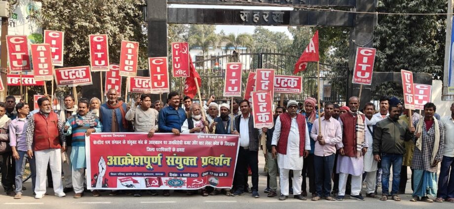 सहरसा: केद्रीय श्रम संगठन के राष्ट्रीय व्यापी आह्वान पर जिला परिषद केंपस से प्रतिरोध मार्च निकाला गया। थाना चौक वीर कुंवर सिंह चौक होते अम्बेडकर प्रतिमा होते सरकार के खिलाफ गगनचुंबी नारे लगाते केंद्रीय बजट में किसान मजदूर के साथ पक्षपात एवं चार लेबर कोड वापस लेने श्रम कार्यालय में अफसर साही खत्म करने तथा अन्य मांगो को लेकर किया आक्रोश पूर्ण प्रदर्शन किया जिसके बाद प्रदर्शन सभा में तब्दील हो गया।