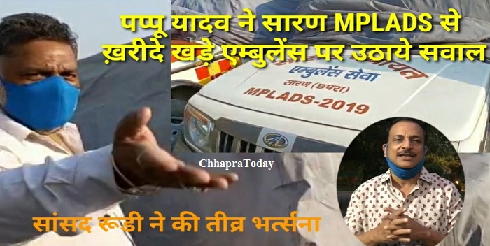 पप्पू यादव पहुंचे सारण, एमपी फंड के खड़े एम्बुलेंस पर उठाए सवाल, वही दूसरी ओर इस मामले पर अपनी प्रतिक्रिया देते हुए सांसद राजीव प्रताप रूडी ने कहा कि पप्पू यादव सस्ती लोकप्रियता के लिए ऐसा कर रहे है. ड्राईवर के आभाव में एम्बुलेंस खड़े है. वही 50 से अधिक एम्बुलेंस आम लोगों की सेवा में जुटे हुए है