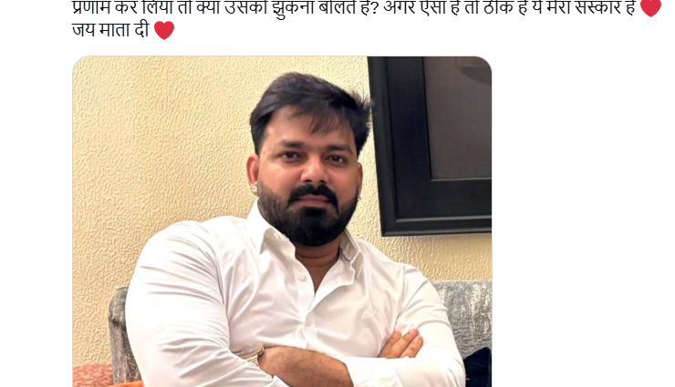 पवन सिंह ने अपनी एक तस्वीर साझा करते हुए लिखा कि “मेरे लिए इंसानियत मायने रखता है। अगर मेरे से बड़ा कोई मेरे सामने खड़ा है और मैंने उनको प्रणाम कर लिया तो क्या उसको झुकना बोलते हैं? अगर ऐसा है तो ठीक है ये मेरा संस्कार है।”