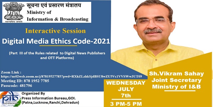 पटना: पत्र सूचना कार्यालय (पटना, लखनऊ, रांची व देहरादून) द्वारा डिजिटल मीडिया आचार संहिता 2021 पर एक विशेष ई-बैठक का आयोजन किया गया है इसका उद्देश्य ओटीटी प्लेटफार्म और डिजिटल समाचार प्रकाशकों के लिए सूचना एवं प्रसारण मंत्रालय द्वारा बनाई गयी डिजिटल मीडिया आचार संहिता के बारे में जानकारी देना है।