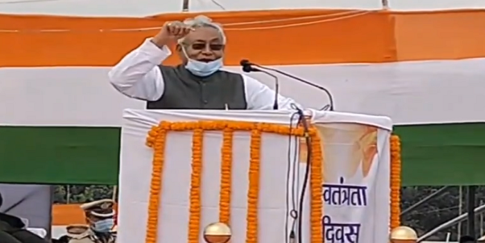 पटना: मुख्यमंत्री नीतीश कुमार शनिवार को गांधी मैदान में सुबह नौ बजे झंडोत्तोलन किया. इस दौरान वे 11 टुकड़ियों की परेड की सलामी ली. इस बार झांकियां नहीं निकली. ऐसे में कोरोना के साये के बीच राजधानी वासी घरों में रहकर ही आजादी का पर्व मना रहे हैं.