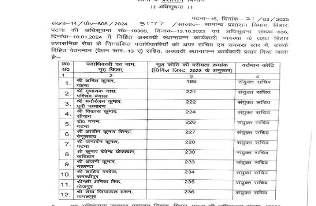 जारी अधिसूचना के अनुसार बिहार प्रशासनिक सेवा के 19 अधिकारियों को संयुक्त सचिव एवं समकक्ष स्तर वेतनमान- 13 में प्रमोशन देकर कार्यकारी प्रभार दिया गया है, जबकि 13 अधिकारियों को विशेष सचिव एवं समकक्ष स्तर वेतनमान- 14 में प्रोन्नति देकर कार्यकारी प्रभार दिया गया है।