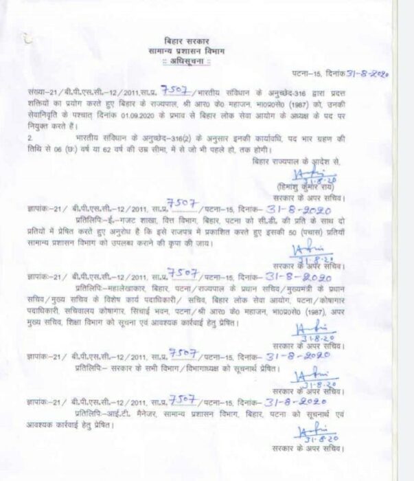 Patna: वरिष्ठ IAS अधिकारी आरके महाजन को बिहार लोक सेवा आयोग का अध्यक्ष बनाया गया है. वे 1987 बैच के भारतीय प्रशासनिक सेवा के अधिकारी है. सामान्य प्रशासन विभाग ने इसको लेकर अधिसूचना जारी कर दी है.