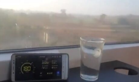 इस वीडियो में वंदे भारत स्लीपर 180 किलोमीटर प्रति घंटे की स्पीड से दौड़ रही है। ट्रेन की स्पीड एक फोन के स्पीडोमीटर पर देखी जा सकती है। फोन के पास पानी से पूरा भरा एक गिलास रखा है। हैरानी की बात यह है कि एक बूंद पानी नहीं छलका।