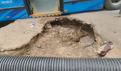 मेट्रो स्टेशन के नजदीक बड़ा हादसा टला, मेहरौली बदरपुर रोड पर डीटीसी की बस 10 से 15 फीट गड्ढे में फंसी