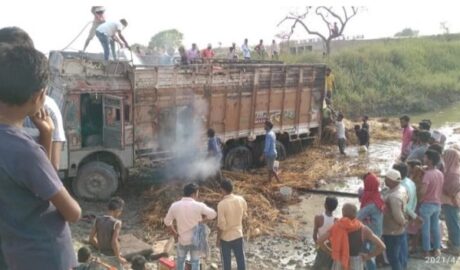 बिजली के तार से गेहूं का बोझा लदे ट्रक में लगी आग