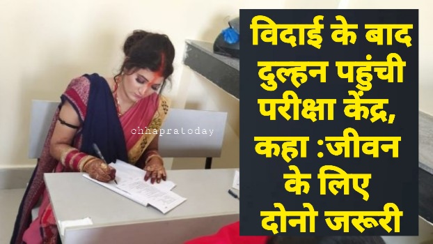 दूल्हे और उसके स्वजन ने भी दुल्हन की पढ़ाई के प्रति रुचि देख खुशी जताई और उसे दूल्हे के साथ परीक्षा देने के लिए जेपी विश्वविद्यालय के साइंस ब्लाक भेजा. परीक्षा देने के बाद दूल्हा अपनी दुल्हन को अपने घर सीहोर लेकर पहुंचा. इस दौरान करीब ढाई घंटे तक दूल्हा कार में बैठकर दुल्हन का इंतजार करता रहा. शहर के मौना वानगंज निवासी वासुकीनाथ प्रसाद की भतीजी रौशनी की शादी गोपालगंज में हुई है. 21 नवंबर को छपरा में उसके घर बारात आयी थी.