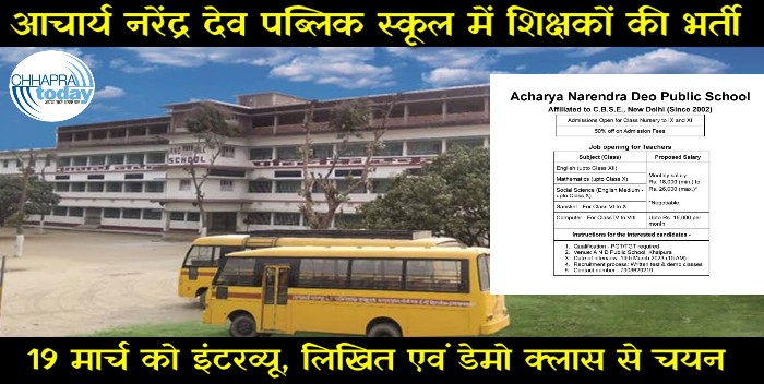 Chhapra: शहर के आचार्य नरेंद्र देव पब्लिक स्कूल में शिक्षकों की भर्ती को लेकर विज्ञप्ति निकाली गई है. शिक्षकों के भर्ती को लेकर इंटरव्यू 19 मार्च को आयोजित की जाएगी. जिसके लिए आचार्य नरेंद्र देव पब्लिक स्कूल परिसर में लिखित परीक्षा और क्लास डेमो का आयोजन किया जायेगा.