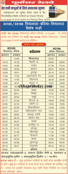 रेलवे के अनुसार गाड़ी संख्या 03105 सियालदह-बलिया 12 दिसंबर 2020 से अगले आदेश तक प्रतिदिन एवम गाड़ी संख्या 03106 बलिया-सियालदह 12 दिसंबर से अगले आदेश तक प्रतिदिन चलेगी.