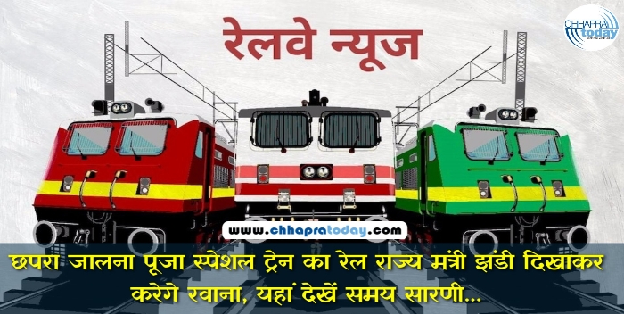 रेल प्रशासन द्वारा यात्रियों की सुविधा के लिये जालना- छपरा- जालना के मध्य एक पूजा विशेष साप्ताहिक एक्सप्रेस 07651/07652 गाड़ी का संचलन का शुभारंभ 26 अक्टूबर, 2022 को जालना से किया जाना प्रस्तावित है जिसका उद्धघाटन विशेष गाड़ी संख्या -07651 चलाकर किया जायेगा, जिसके पश्चात नियमित विशेष गाड़ी का संचलन 28 अक्टूबर से प्रत्येक शुक्रवार को छपरा से तथा 02 नवम्बर से प्रत्येक बुधवार को जालना से किया जायेगा.
