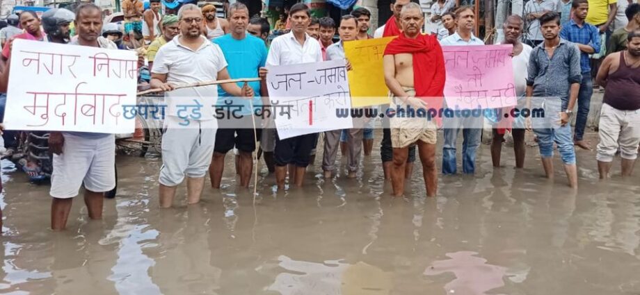 Chhapra: जलजमाव से परेशान मौना मुहल्ले के स्थानीय लोगों और दुकानदारों ने गुरुवार को प्रदर्शन किया। स्थानीय लोगों ने स्थानीय पार्षद और नगर निगम समेत जनप्रतिनिधियों के खिलाफ प्रदर्शन किया। लोगों का कहना था कि नगर निगम के द्वारा टैक्स तो बढ़ दिया गया है पर सुविधाओं का घोर आभाव है। दुकानदारों तक ग्रहण नहीं पहुँच रहे हैं। जिससे उनकी आर्थि स्थिति भी खराब हो रही है।