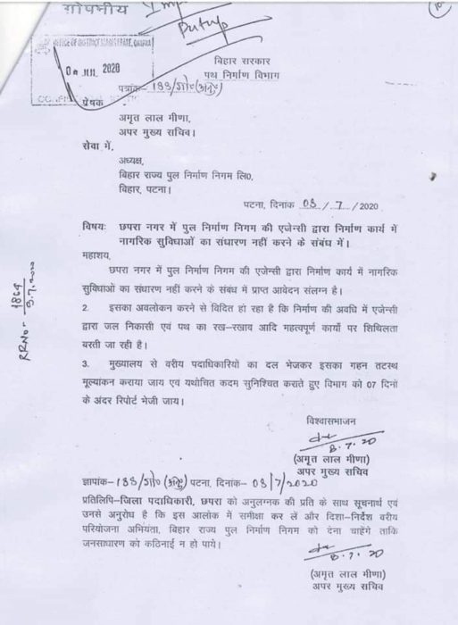 इस समस्या पर पथ निर्माण विभाग के अपर मुख्य सचिव ने 7 दिनों के अंदर वरिष्ठ अधिकारियों की टीम द्वारा तटस्थ जांच करते हुए पूरी जांच रिपोर्ट भेजने को कहा है. जिसे लेकर सारण के जिलाधिकारी ने आदेश जारी किये है. जिलाधिकारी ने अपर समाहर्ता को समस्या के निराकरण के लिए नगर आयुक्त, कार्यपालक अभियंता, पुल निर्माण निगम, कार्यकारी एजेंसी और स्थानीय नागरिकों के साथ स्थल भ्रमण कर विचार विमर्श के उपरांत रिपोर्ट देने का आदेश दिया है.