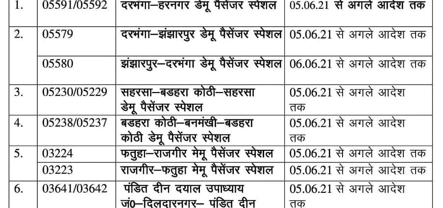 पूमरे की ओर से बुधवार को इसके बारे में जानकारी दी गई है। इन ट्रेनों के चलने से यूपी-बिहार के यात्रियों को बड़ी राहत मिलेगी। यह ट्रेनें डेमू और मेमू स्पेशल पैसेंजर बनकर पांच जून से पटरी पर दौड़ने लगेंगी। इससे बिहार के दरभंगा, सहरसा, राजगीर, गया, वैशाली, सोनपुर, कटिहार, समस्तीपुर आदि जिलों के यात्रियों को राहत मिलेगी।