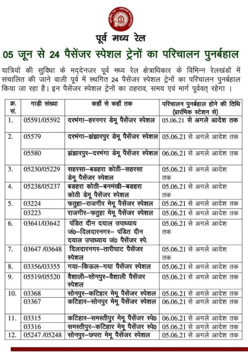 पटना: पूर्व मध्य रेल (पूमरे) ने कोरोना के बढ़ते प्रकोप और यात्रियों की घटती सख्या के कारण रद कर दी गईं 24 सवारी गाड़ी को फिर से शुरू करने का निर्णय किया है।
