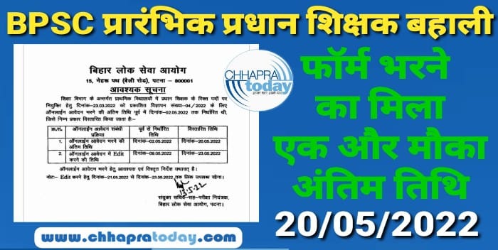 Chhapra: सरकारी स्कूल में हेडमास्टर बनने का सपना अगर टूट गया हो तो घबराने की बात नहीं है. बीपीएससी ने प्रारंभिक स्कूलों में हेडमास्टर बनने के लिए भरे जाने वाले फॉर्म भरने की तिथि बढ़ा दी है. जारी सूचना के अनुसार अब योग्य उम्मीदवार 20 मई तक फॉर्म भर सकते है. साथ ही फॉर्म में सुधार 23 मई तक कर सकते है.
