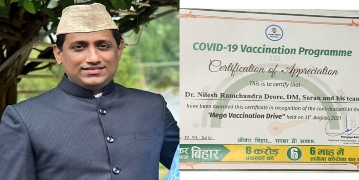 Chhapra: स्वास्थ्य विभाग के द्वारा सारण के जिलाधिकारी डॉ निलेश रामचंद्र देवरे को सम्मानित किया गया। सारण जिला में लगातार प्रतिदिन युद्धस्तर पर स्वास्थ्य कर्मियों द्वारा टीकाकरण कराया जा रहा है। सारण जिला वासियों का भी सहयोग मिल रहा है। सारण जिले में जिला प्रशासन के द्वारा 31 अगस्त को मेगा वैक्सीनेशन ड्राइव चला गया था। जिसके तहत 1 लाख 10 हज़ार लोगों को वैक्सीन 1 दिन में दिया गया था। डिजिटल प्लेटफार्म पर जिलाधिकारी स्वयं एवं सारण जिला प्रशासन के पेज से लगातार लोगों को टीकाकरण को लेकर जागरूक कर रहे हैं।