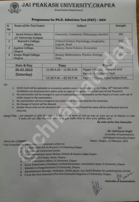 Chhapra: जयप्रकाश विश्वविद्यालय के अंतर्गत प्री पीएचडी ऐडमिशन टेस्ट की तारीख की घोषणा हो गयी है.