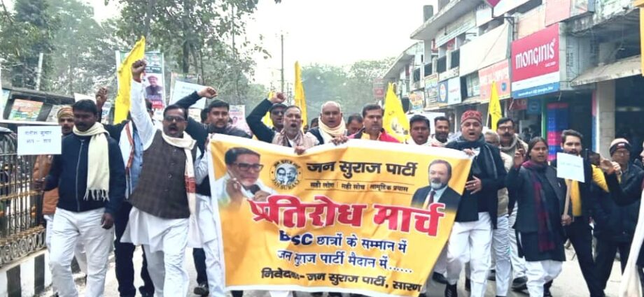छपरा: जन सुराज के जिला इकाई द्वारा गुरुवार को पटना में बीपीएससी अभ्यर्थियों पर कथित लाठी चार्ज किए जाने तथा छात्रों के समर्थन में सत्याग्रह अनशन पर बैठे जनसुरज के सूत्रधार प्रशांत किशोर की गिरफ्तारी के विरोध सहित पांच सूत्री मांगों के समर्थन में छपरा शहर में प्रतिरोध मार्च निकाला वहीं मुख्यमंत्री का पुतला दहन किया गया। जन सुराज के जिलाध्यक्ष बच्चा राय के नेतृत्व में कार्यकर्ताओं ने विरोध प्रदर्शन करते हुए छपरा के जिला पारिषद कार्यालय गेट से चलकर नगरपालिका चौक होते हुए थाना चौक छपरा शहर होते हुए फिर नगरपालिका चौक पर पहुंच मुख्यमंत्री नीतीश कुमार का पुतला दहन किया।