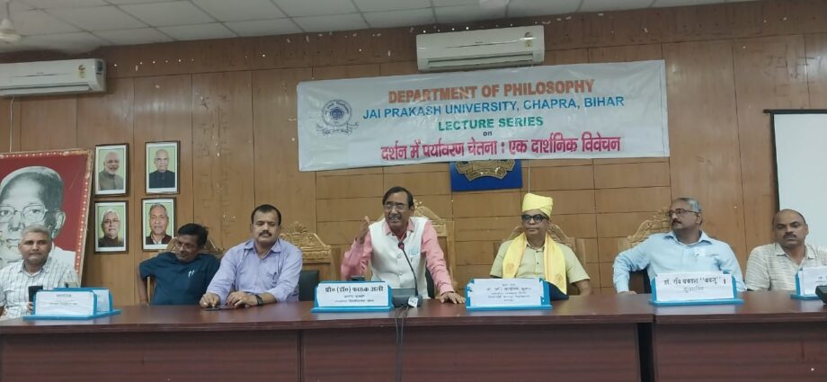 Chhapra: कुलपति प्रोफेसर फारूक अली की अध्यक्षता में भर्चुअल मोड पर एवं आफ लाइन के अन्तर्गत व्याख्यान विश्वविद्यालय के सीनेट हाल मे हुआ। कुलपति प्रोफेसर फारूक अली ने कहा कि पर्यावरण संरक्षण के लिए यदि हम अब सचेत नही होंगे तो बहुत कठिनाई मे सारा विश्व हो जायेगा। प्रोफेसर मृत्युंजय कुमार ने अपने उद्बोधन मे कहा कि वृक्ष वर्षा ऋतु के 81प्रतिशत जल को अपनी जडों मे रोकते हैं. पहाङी क्षेत्र में वनों का संरक्षण करना आवश्यक है।महान दार्शनिक पीटर सिंगर का उदाहरण देते हुए कहा कि बच्चो को यदि प्राकृतिक परिवेश में रखा जाए तो उनका विकास बहुत अच्छी तरह से होता है।हमे समझदारी से प्राकृतिक संसाधनों का इस्तेमाल करना है। पेङों के लगाने से प्रकृति का संरक्षण होता है।