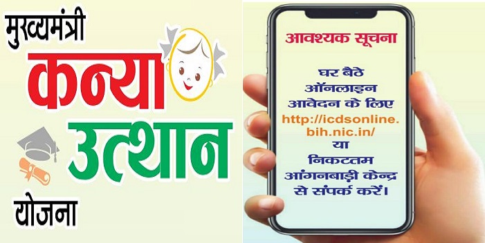 समाज कल्याण विभाग के पोर्टल पर मुख्यमंत्री कन्या उत्थान योजना के ऑनलाइन आवेदन कर सकते हैं। http://icdsonline.bih.nic.in/ इस लिंक पर क्लिक करने के बाद फार्म अप्लाई कर सकते हैं।