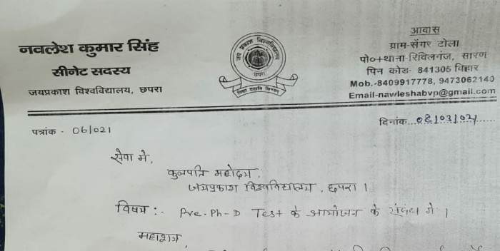 Chhapra: जयप्रकाश विश्वविद्यालय प्रशासन से शोधार्थियों के हक में प्री पीएचडी टेस्ट जल्द कराने की सीनेट सदस्य नवलेश सिंह ने मांग की है.