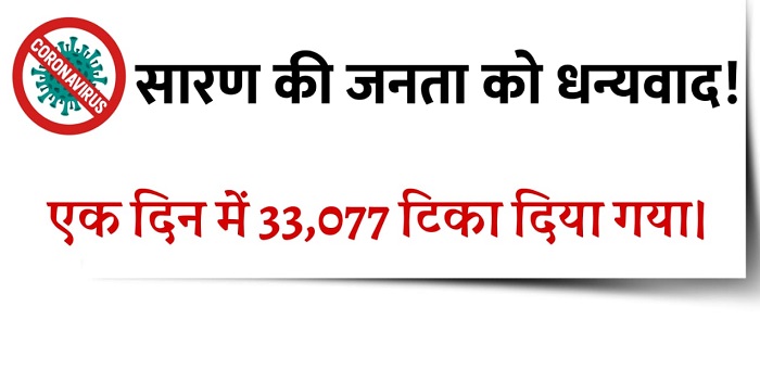 जिले में टीकाकरण को लेकर युवाओं से लेकर बुजुर्गों में उत्साह देखने को मिल रहा है. इसका नतीजा है कि 21 जून को जिले में 33,077 टिके एक दिन में लगाये गए. सारण जिला प्रशासन ने इस उपलब्धि पर जिलेवासियों का आभार जताया है.