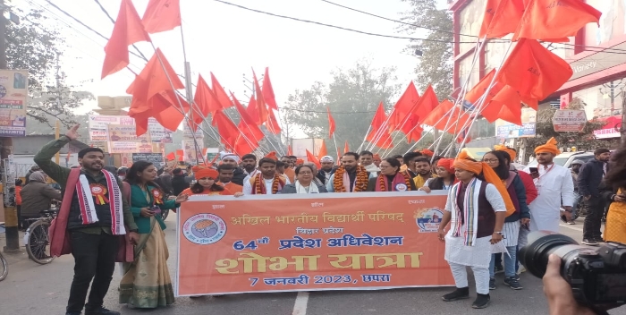 छपरा: अखिल भारतीय विद्यार्थी परिषद् बिहार के 64वे प्रदेश अधिवेशन के तीसरे दिन शनिवार 07 जनवरी को भव्य शोभा यात्रा निकाली गई । जिसमे पूरे प्रदेश से आए छात्र-छात्रा एवं शिक्षक शामिल हुए भारत माता की जय, वन्दे मातरम् के नारों के साथ निकली । शोभा यात्रा के विहंगम दृश्य ने पूरे शहर का ध्यान अपनी ओर आकर्षित किया । यह शोभा यात्रा अधिवेशन स्थल महर्षि दधीचि नगर (राम जयपाल महाविद्यालय) से निकलकर थाना चौक, साहेबगंज, खनुआ, कटहरी बाग़, के रास्ते मेवालाल चौक होते हुए मौना नीम, मौना चौक से नगरपालिका चौक होते हुए योगिनिया कोठी के रास्ते कचहरी स्टेशन परिसर में पहुंचा।