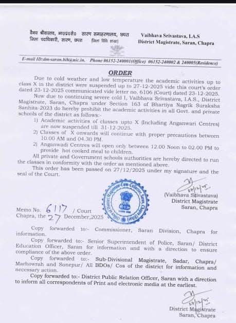 Chhapra: सारण में वर्त्तमान में जारी शीतलहर के आलोक में जिला दंडाधिकारी सारण द्वारा सारण जिला के सभी विद्यालयों में (आंगनबाड़ी सहित) कक्षा 10 वीं तक पठन पाठन गतिविधि पर दिनांक 31.12.2025 तक प्रतिबंध लगाया गया है। वही 10 वीं से ऊपर की कक्षाएं 10 AM से 04.30 PM के बीच संचालित