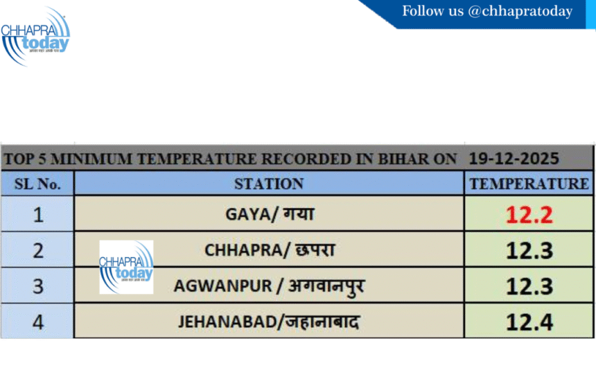 मौसम विभाग के आंकड़ों के अनुसार 19 दिसंबर 2025 को राज्य में न्यूनतम तापमान के लिहाज से गया सबसे ठंडा जिला रहा, जहां पारा 12.2 डिग्री सेल्सियस दर्ज किया गया।