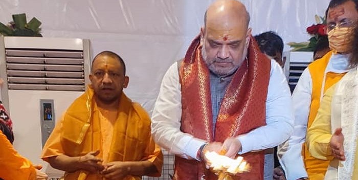 इसके बाद 03ः15 बजे जर्मन हैंगर पंडाल के बीच भूमि पूजन कर विंध्य कारिडोर की आधारशिला रखी। काशी विश्वनाथ मंदिर के तीन व विंध्याचल के दो विद्वान पंडितों ने मंत्रोच्चारण के बीच भूमि-पूजन कराया। भूमि पूजन के बाद 03ः15 बजे गृहमंत्री अमित शाह व मुख्यमंत्री योगी आदित्यनाथ जनसभा स्थल महुवरिया के लिए प्रस्थान किए।