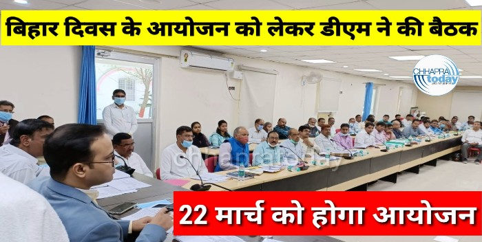 छपरा :जिलाधिकारी राजेश मीणा की अध्यक्षता में 22 मार्च को बिहार दिवस धूमधाम से मनाने हेतु बैठक समाहरणालय सभागार में आहूत की गयी। जिलाधिकारी महोदय के द्वारा उप विकास आयुक्त सारण की अध्यक्षता में बिहार दिवस मनाने हेतु कमिटि बनाने का निर्देश दिया गया।
