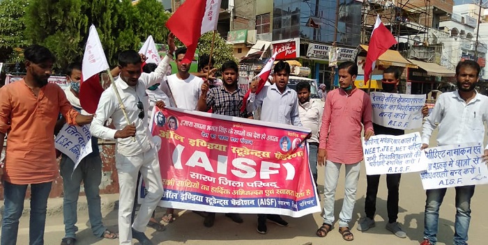 Chhapra: ऑल इंडिया स्टूडेंट्स फेडरेशन (एआईएसएफ) सारण जिला इकाई के छात्रों ने संगठन के राज्यव्यापी आह्वान पर अपनी विभिन्न मांगों इंटरमीडिएट नामांकन में छात्रों से अवैध वसूली बंद कर, छात्रों से अवैध वसूली किए गए रुपए की वापसी करने, कोरोना एवं बाढ़ काल में 06 माह के बिजली बिल एवं रूम रेंट माफ करने, नई शिक्षा नीति 2020 वापस लेने, निजीकरण पर रोक लगाने, बढ़ती बेरोजगारी दूर करने, सभी तरह की प्रतियोगी परीक्षाओं, विश्वविद्यालयों की परीक्षाओं को तत्काल रद्द करने, आदि को लेकर शहर में आक्रोश मार्च निकाला एवं बिहार के मुख्यमंत्री नीतीश कुमार का पुतला फूंक रोष प्रकट किया.