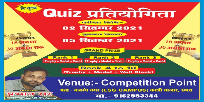 Chhapra: हर बार की तरह इस बार भी कंपटीशन पॉइंट में है निशुल्क क्विज प्रतियोगिता का आयोजन हो रहा है जो भी प्रतिभागी इस प्रतियोगिता में भाग लेना चाहते हैं तो उन्हें बता देगी क्विज प्रतियोगिता में निशुल्क क्विज का रजिस्ट्रेशन प्रारंभ है जो छात्र रजिस्ट्रेशन कराने आएंगे वह साथ में दो फोटो लेकर आएंगे और उन्हें एडमिट कार्ड दे दिया जाएगा जिसका लिखित परीक्षा 2 सितंबर को दिन में 11:30 में होगा जिसका परिणाम शिक्षक दिवस और कोचिंग के साथ वर्षगांठ के शुभ अवसर पर 5 सितंबर को किया जाएगा और साथ में TOP 10 को पुरस्कृत किया जाएगा जिसमें बहुत सारे पुरस्कार के रूप में दिया जाएगा