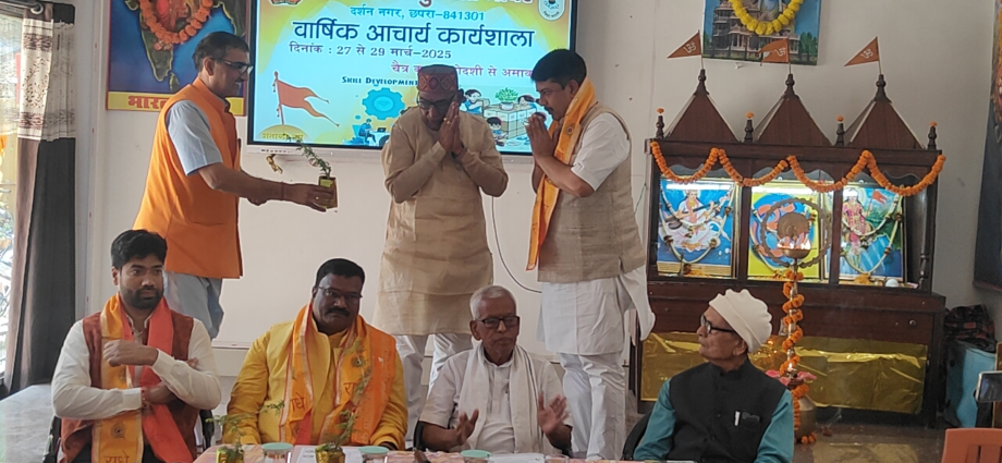 Chhapra: विद्या भारती विद्यालय सरस्वती शिशु विद्या मंदिर द्वारा आयोजित तीन दिवसीय आचार्य कार्यशाला के प्रथम दिवस के प्रथम सत्र के उद्घाटन के मुख्य अतिथि रामलाल सिंह, सचिव, लोक शिक्षा समिति, अमरनाथ प्रसाद अध्यक्ष विद्यालय प्रबंधकारिणी समिति, सुरेश प्रसाद सिंह, सचिव, विद्यालय प्रबंधकारिणी समिति, विद्यालय के प्रधानाचार्य फणीश्वरनाथ एवं राजेश्वर प्रसाद, प्रमुख हिंदी विभाग, लंगट सिंह महाविद्यालय के द्वारा दीप प्रज्वलन कर किया गया।