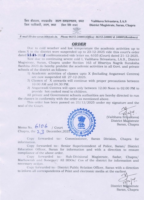 Chhapra: सारण जिले में जारी भीषण शीतलहर को देखते हुए जिला दंडाधिकारी वैभव श्रीवास्तव द्वारा एहतियाती कदम उठाए गए हैं। बच्चों के स्वास्थ्य एवं सुरक्षा के मद्देनज़र जिले के सभी सरकारी एवं निजी विद्यालयों में, आंगनबाड़ी केंद्रों सहित, कक्षा 10वीं तक की पठन-पाठन गतिविधियों पर दिनांक 27 दिसंबर 2025 तक पूर्ण प्रतिबंध लगाया गया है।