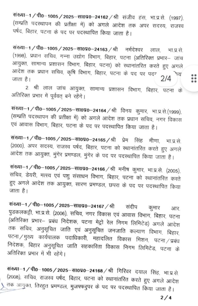 संदीप कुमार आर. पुडकलकट्टी. भा.प्र.से. (2006), सचिव, नगर विकास एवं आवास विभाग, बिहार, पटना (अतिरिक्त प्रभार- प्रबंध निदेशक, पटना मेट्रो रेल निगम लिमिटेड) अगले आदेश तक सचिव, अनुसूचित जाति एवं अनुसूचित जनजाति कल्याण विभाग, बिहार, पटना/मुख्य कार्यपालक पदाधिकारी, महादलित विकास मिशन, पटना/प्रबंध निदेशक, बिहार अनुसूचित जाति सहकारिता विकास निगम लिमिटेड, पटना के अतिरिक्त प्रभार में भी रहेंगे।