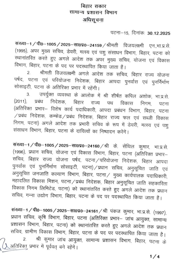 विजयलक्ष्मी एन. भा.प्र.से. (1995), अपर मुख्य सचिव, डेयरी, मत्स्य एवं पशु संसाधन विभाग, बिहार, पटना को स्थानांतरित करते हुए अगले आदेश तक अपर मुख्य सचिव, योजना एवं विकास विभाग, बिहार, पटना के पद पर पदस्थापित किया गया है। वे अगले आदेश तक सचिव, बिहार राज्य योजना पर्षद, पटना एवं परियोजना निदेशक, बिहार आपदा पुनर्वास एवं पुनर्निर्माण सोसाइटी, पटना के अतिरिक्त प्रभार में रहेंगी।