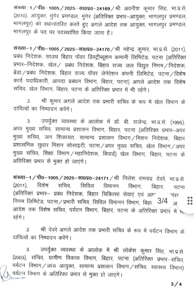महेन्द्र कुमार, भा.प्र.से. (2011). प्रबंध निदेशक, साउथ बिहार पॉवर डिस्ट्रीब्यूशन कम्पनी लिमिटेड, पटना (अतिरिक्त प्रभार-निदेशक, खेल / प्रबंध निदेशक, बिहार राज्य जल विद्युत निगम / निदेशक, ब्रेडा/प्रबंध निदेशक, बिहार राज्य पॉवर जेनेरेशन कंपनी लिमिटेड, पटना/विशेष कार्य पदाधिकारी, आपदा प्रबंधन विभाग, बिहार, पटना) अगले आदेश तक विशेष सचिव, खेल विभाग, बिहार, पटना के अतिरिक्त प्रभार में भी रहेंगे। श्री कुमार अगले आदेश तक प्रभारी सचिव के रूप में खेल विभाग के दायित्वों का निष्पादन करेंगे।
