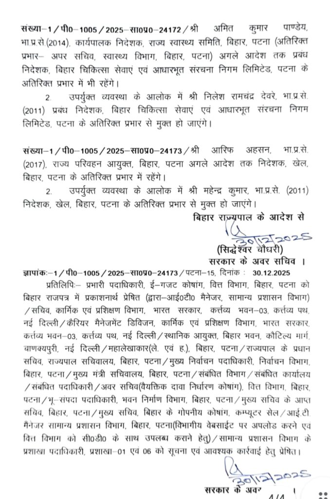 अमित कुमार पाण्डेय, भा.प्र.से. (2014), कार्यपालक निदेशक, राज्य स्वास्थ्य समिति, बिहार, पटना (अतिरिक्त प्रभार- अपर सचिव, स्वास्थ्य विभाग, बिहार, पटना) अगले आदेश तक प्रबंध निदेशक, बिहार चिकित्सा सेवाएं एवं आधारभूत संरचना निगम लिमिटेड, पटना के अतिरिक्त प्रभार में भी रहेंगे।
