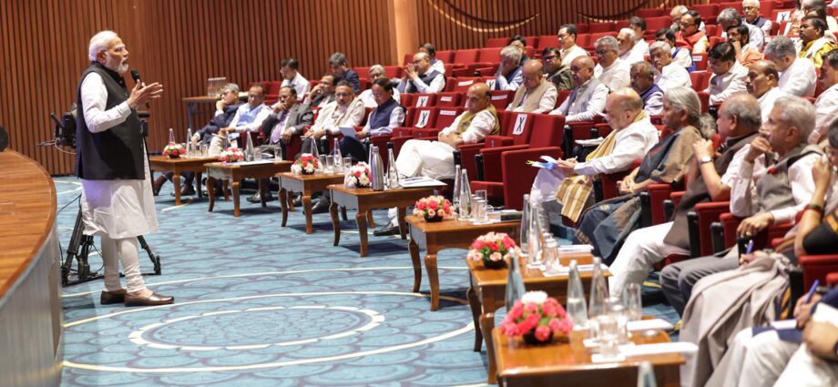 नई दिल्ली, 03 जुलाई (हि.स.)। प्रधानमंत्री नरेन्द्र मोदी ने सोमवार को नई दिल्ली के प्रगति मैदान स्थित कन्वेंशन सेंटर में मंत्री परिषद के साथ बैठक की।