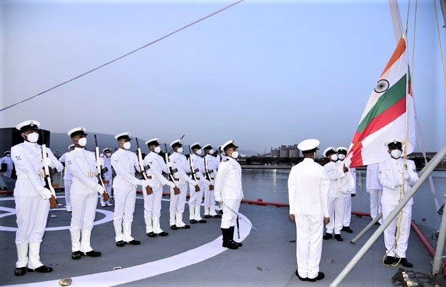 – सूर्यास्त के समय जहाज से उतारा गया राष्ट्रीय ध्वज, नौसेना पताका और डीकमिशनिंग पेनेंट