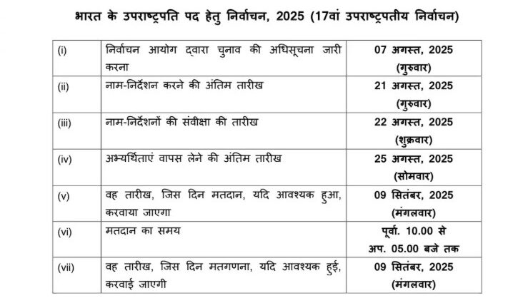 उप राष्ट्रपति चुनाव के लिए 7 अगस्त को अधिसूचना जारी की जाएगी। 21 अगस्त को नाम निर्देशन करने की अंतिम तारीख है। 22 अगस्त को नामांकन पत्रों की समीक्षा की जाएगी। 25 अगस्त तक नामांकन वापस लिए जा सकेंगे। इस पद के लिए एक से अधिक उम्मीदवार होने पर 9 सितंबर को चुनाव होगा। जिसमें राज्यसभा के 233 सदस्य, 12 राज्यसभा के नामित सदस्य और 543 लोकसभा के सदस्य मतदान करेंगे।