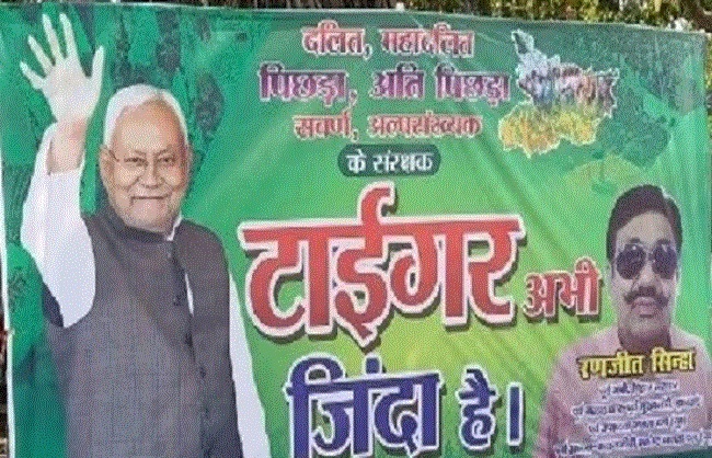 पटना, 13 नवंबर (हि.स.)। बिहार की राजधानी पटना में जदयू दफ्तर के बाहर लगे पोस्टर ने नतीजों से पहले बिहार की राजनीति में उबाल ला दिया है। इस पोस्टर में मुख्यमंत्री नीतीश कुमार को टाइगर जिंदा है बताया गया है।