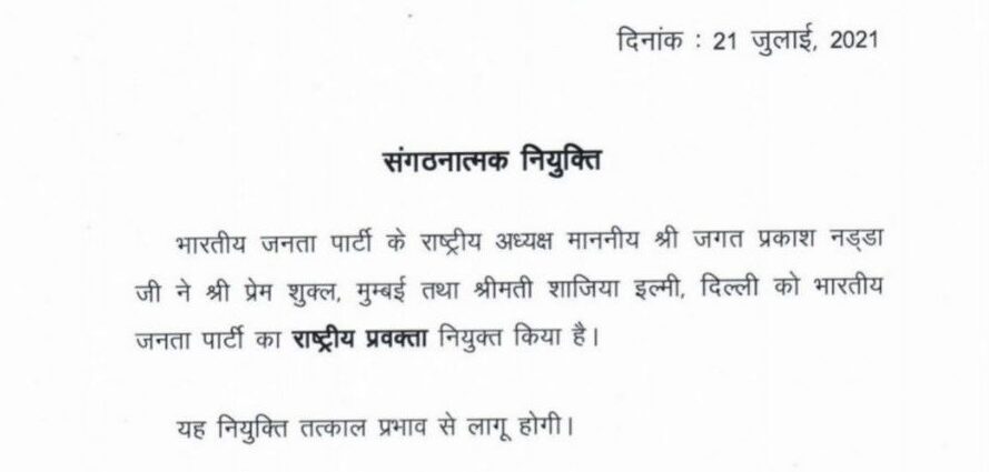 भाजपा नेता प्रेम शुक्ल मीडिया डिबेट में पार्टी का प्रतिनिधित्व करते रहे हैं। वहीं, शाजिया इल्मी भाजपा दिल्ली प्रदेश की प्रवक्ता रही हैं। नए दायित्व के बाद दोनों नेता अब भाजपा राष्ट्रीय प्रवक्ता के रुप में मीडिया में पार्टी का पक्ष रखेंगे।